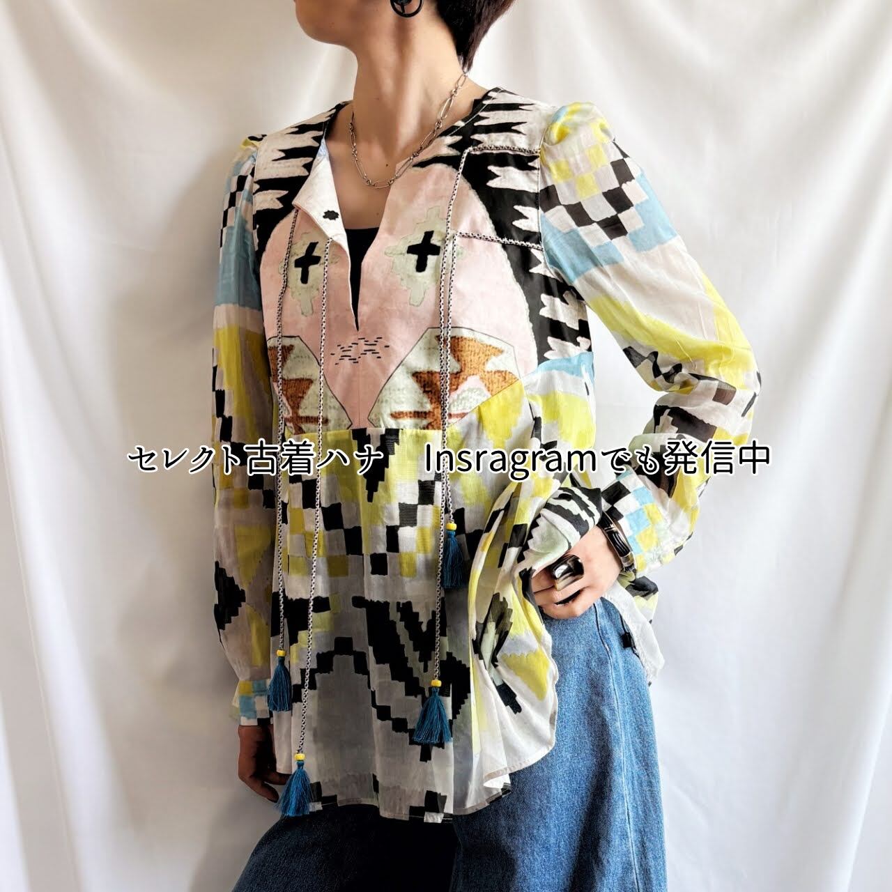 25036 ボヘミアンプリントブラウス コットン シルク 長袖 幾何学 イエロー 黒