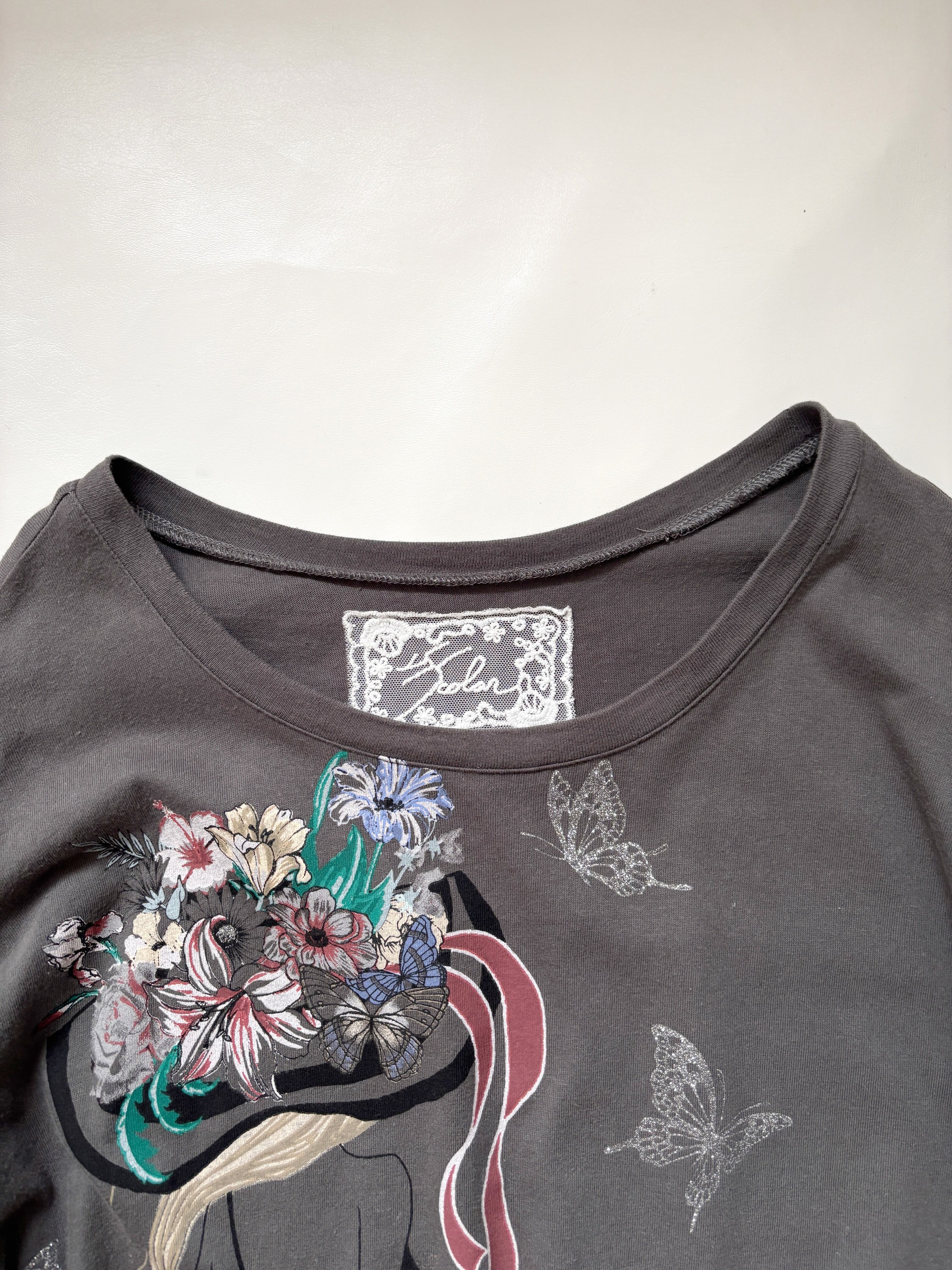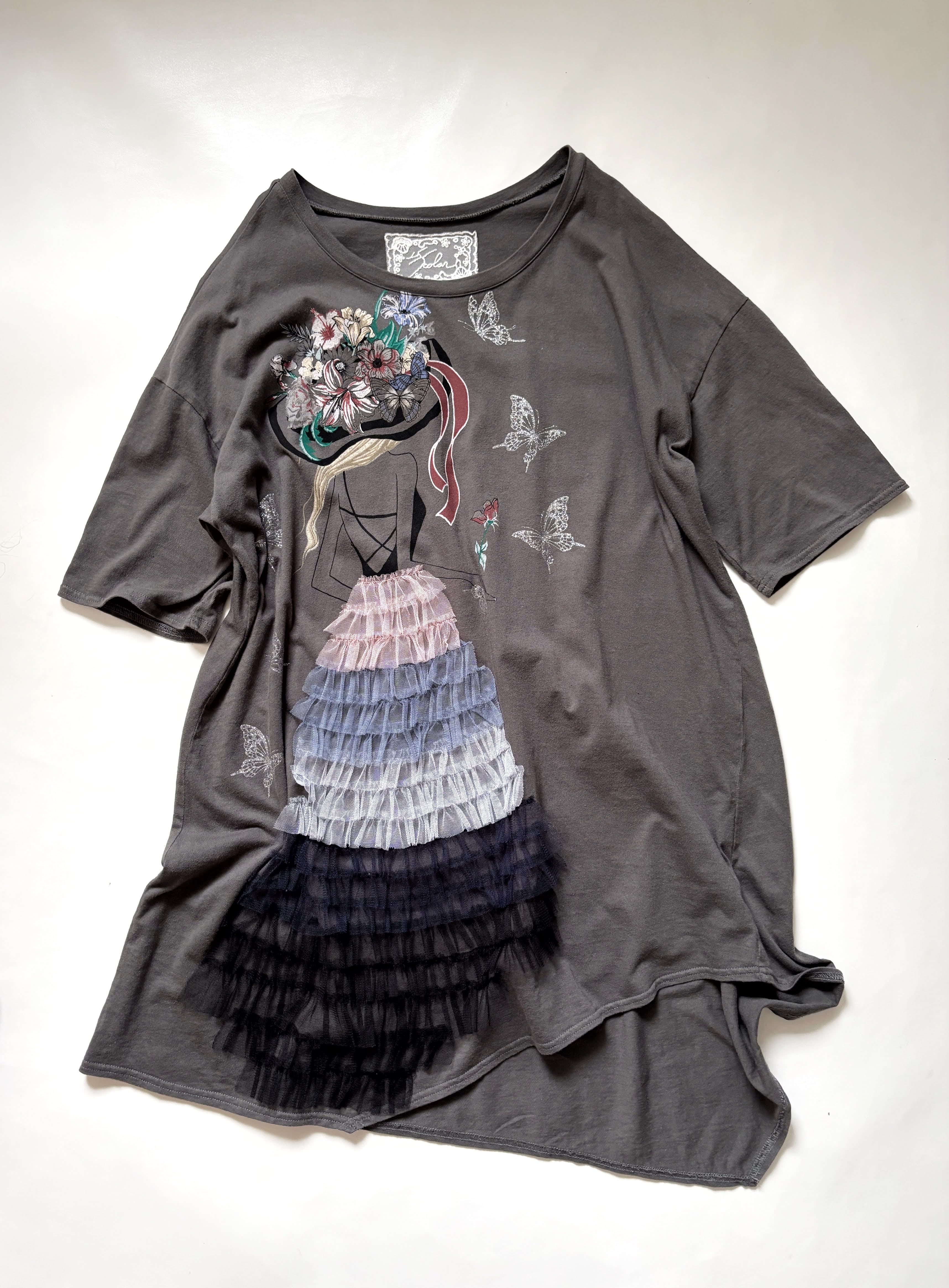 ニュアンスカラーのチュールスカートがデザインされた、スカラーらしい個性派でキュートなデザインです。裾もこれまたスカラーらしいアシメカット。着丈も長めでチュニックのように使えるTシャツです。ゆったりですので着心地も抜群。