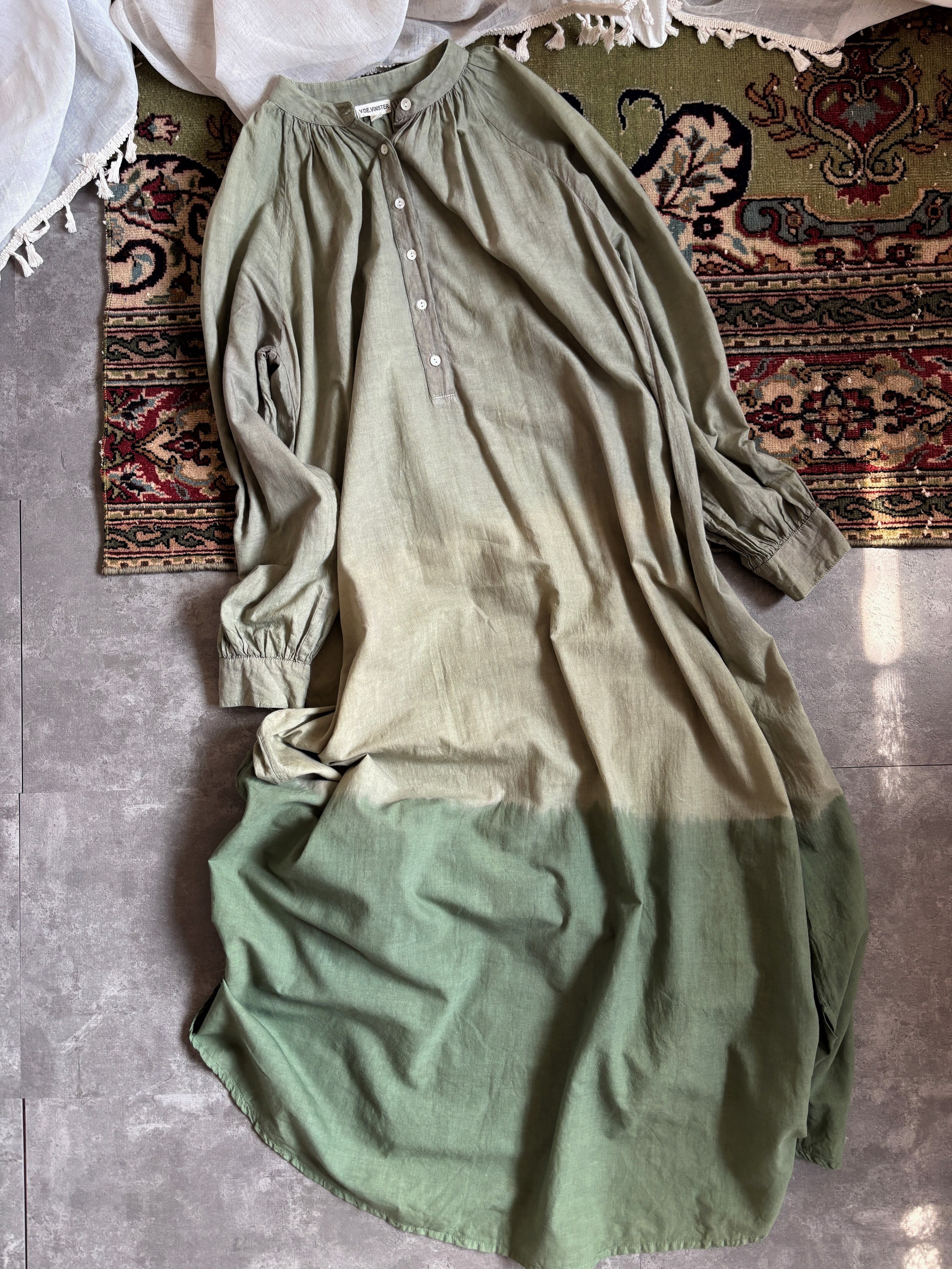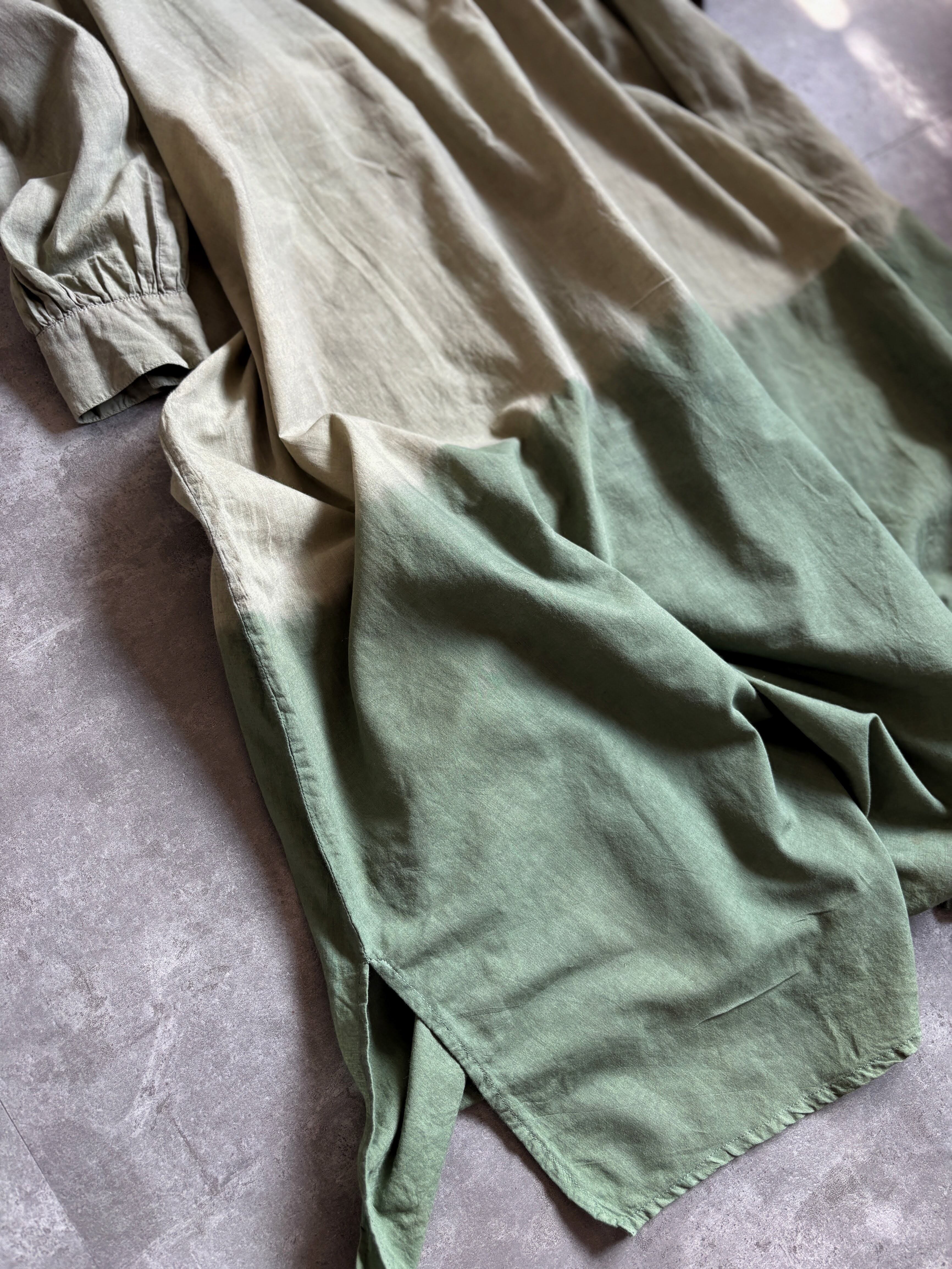 手染め 自然染色 シャツワンピース カディ インド綿 長袖 コットン マキシ丈 カーキ