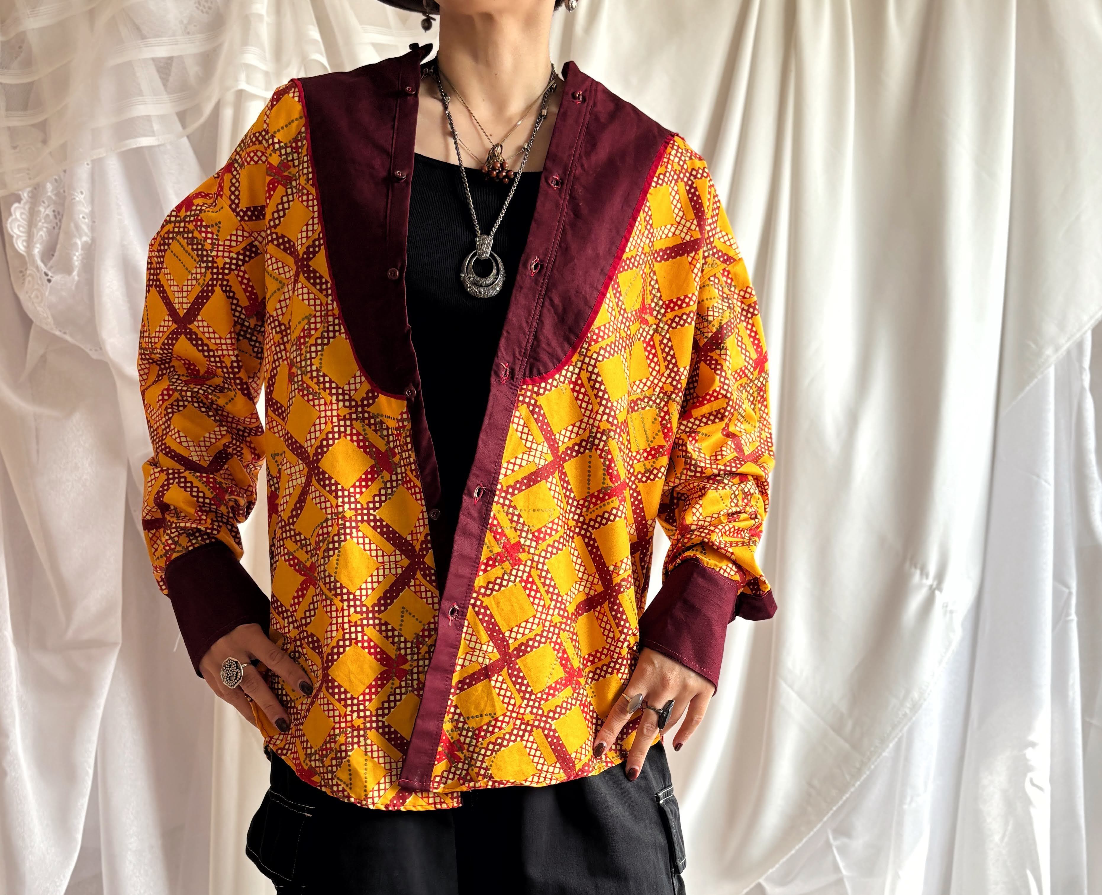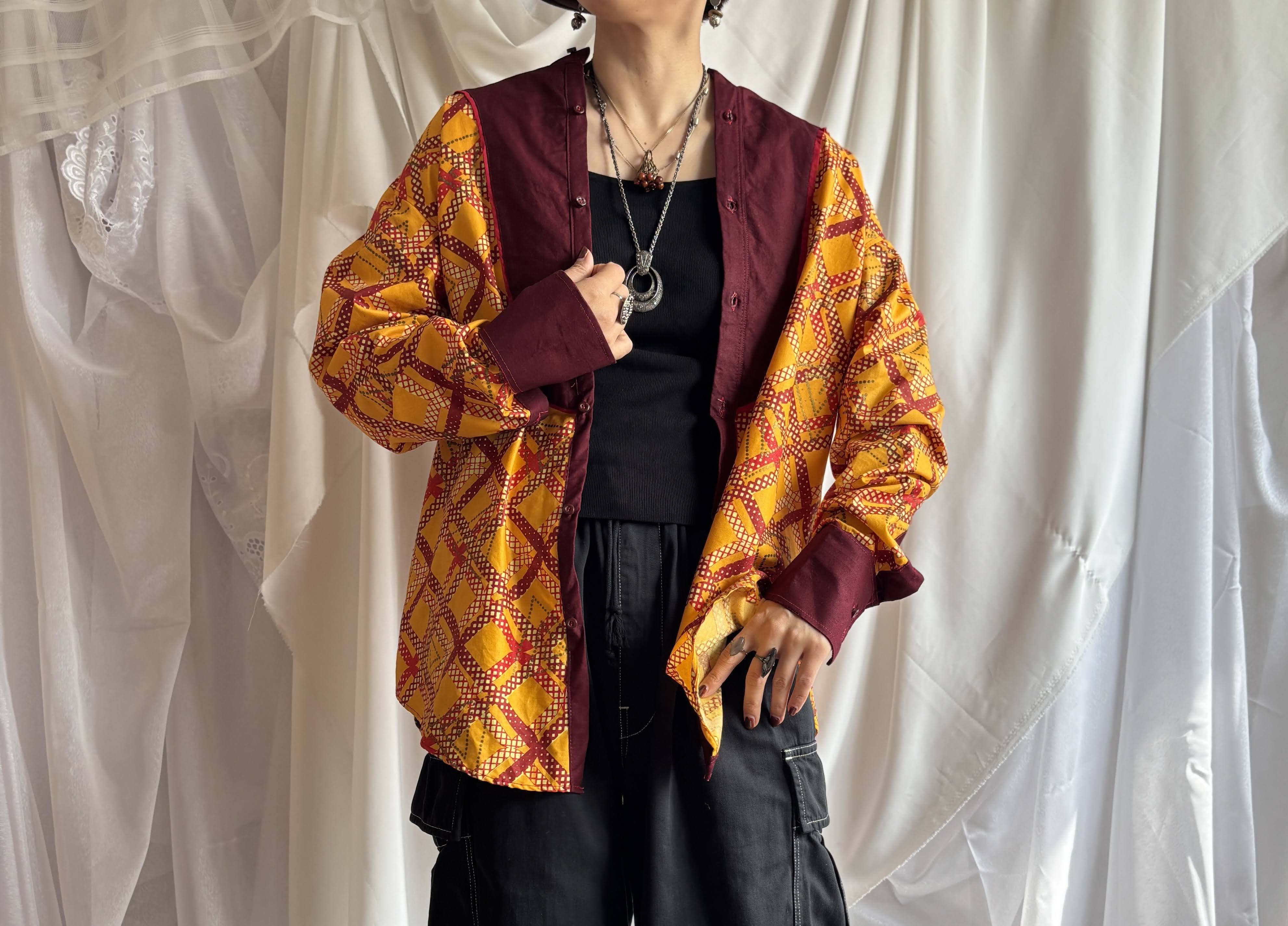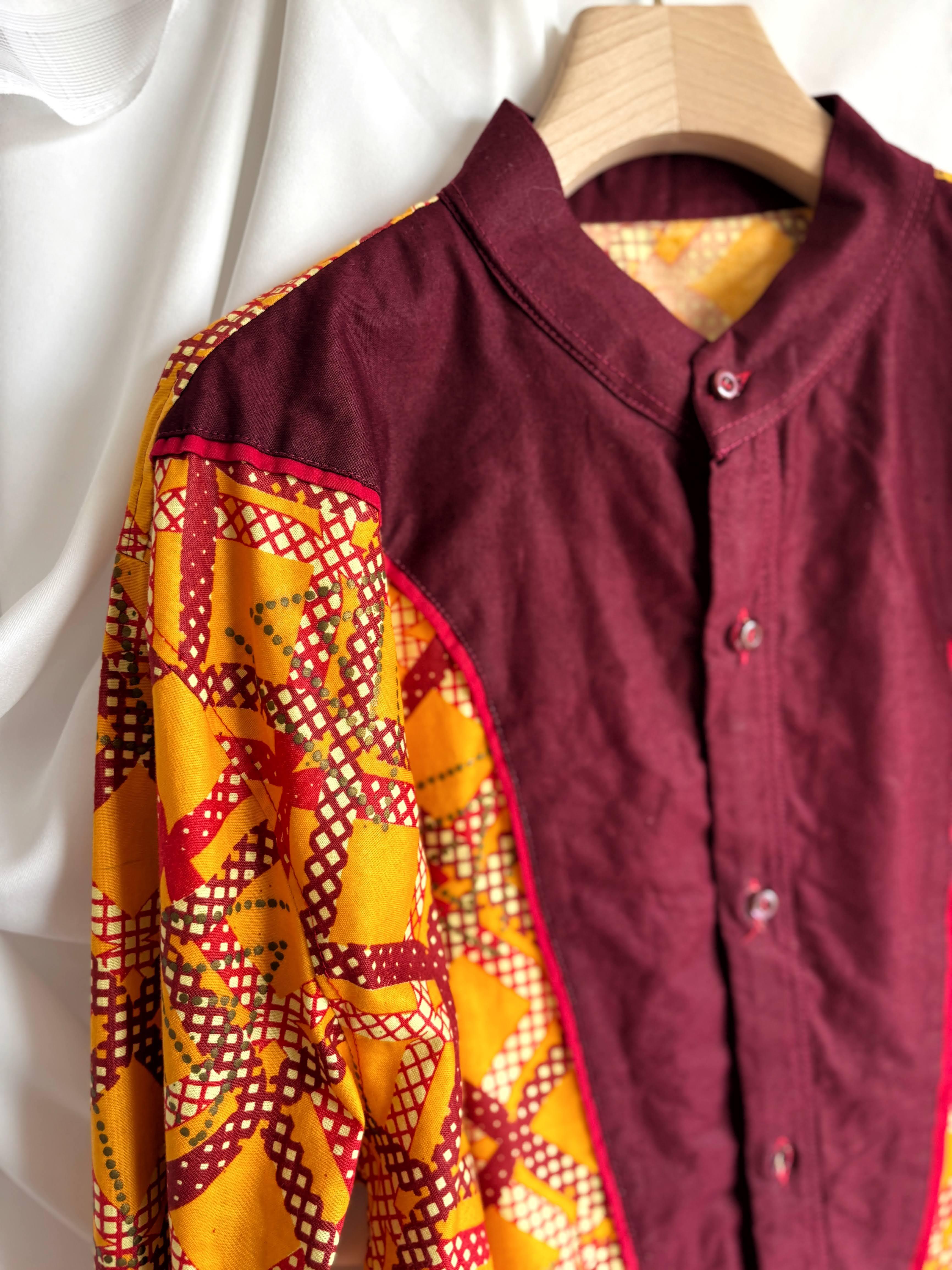 総柄のプリントデザインがかっちょいいシャツです。生地はアフリカンバティックっぽさがありますが不明です(そのくらいしっかりしていて鮮やかです)胸元のエンジカラーの無地生地との切り替えも洒落ていて、繋ぎ目はパイピング(リボンで縫い目をくくる手法)されていてそれもまたオシャレです。