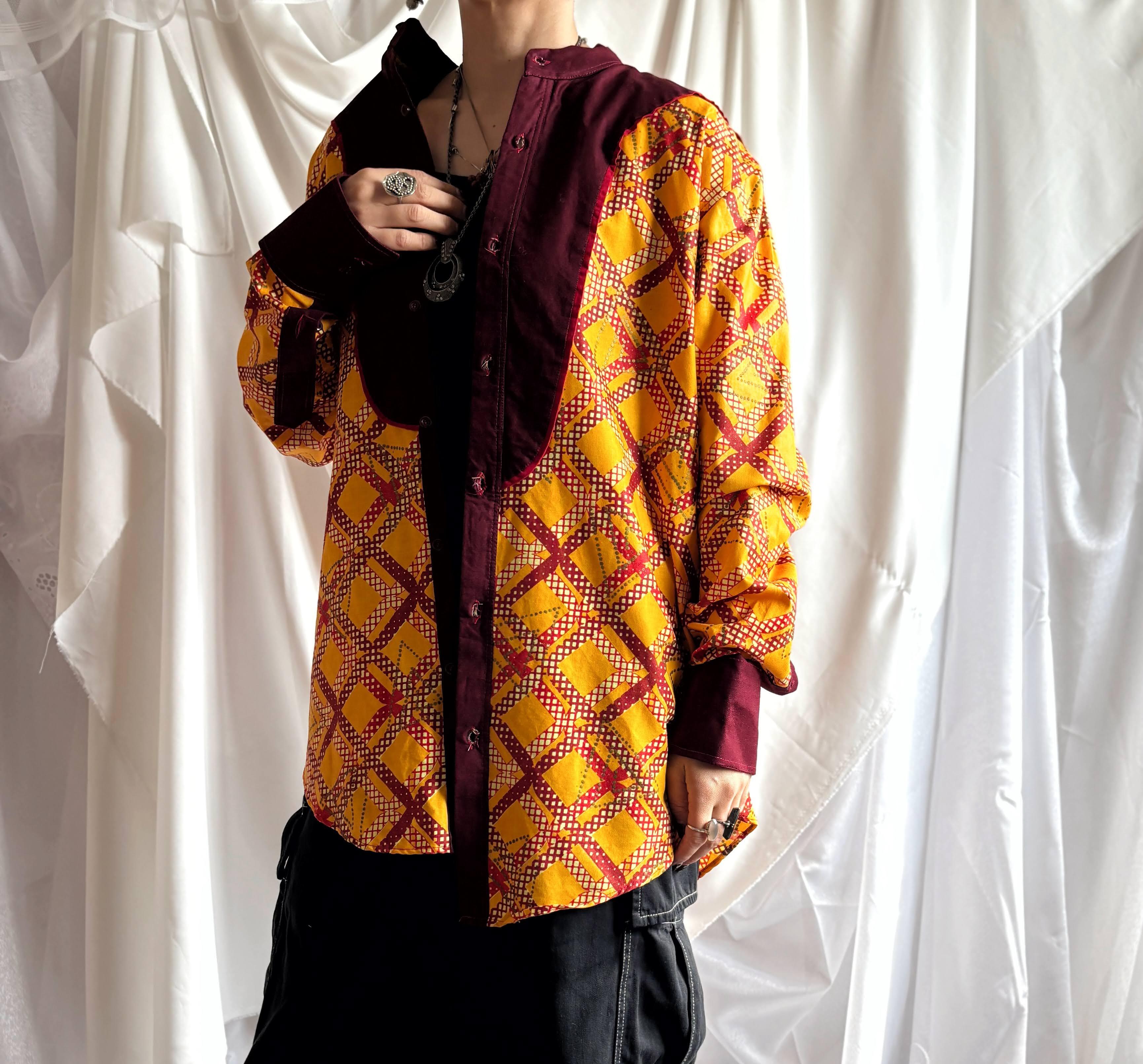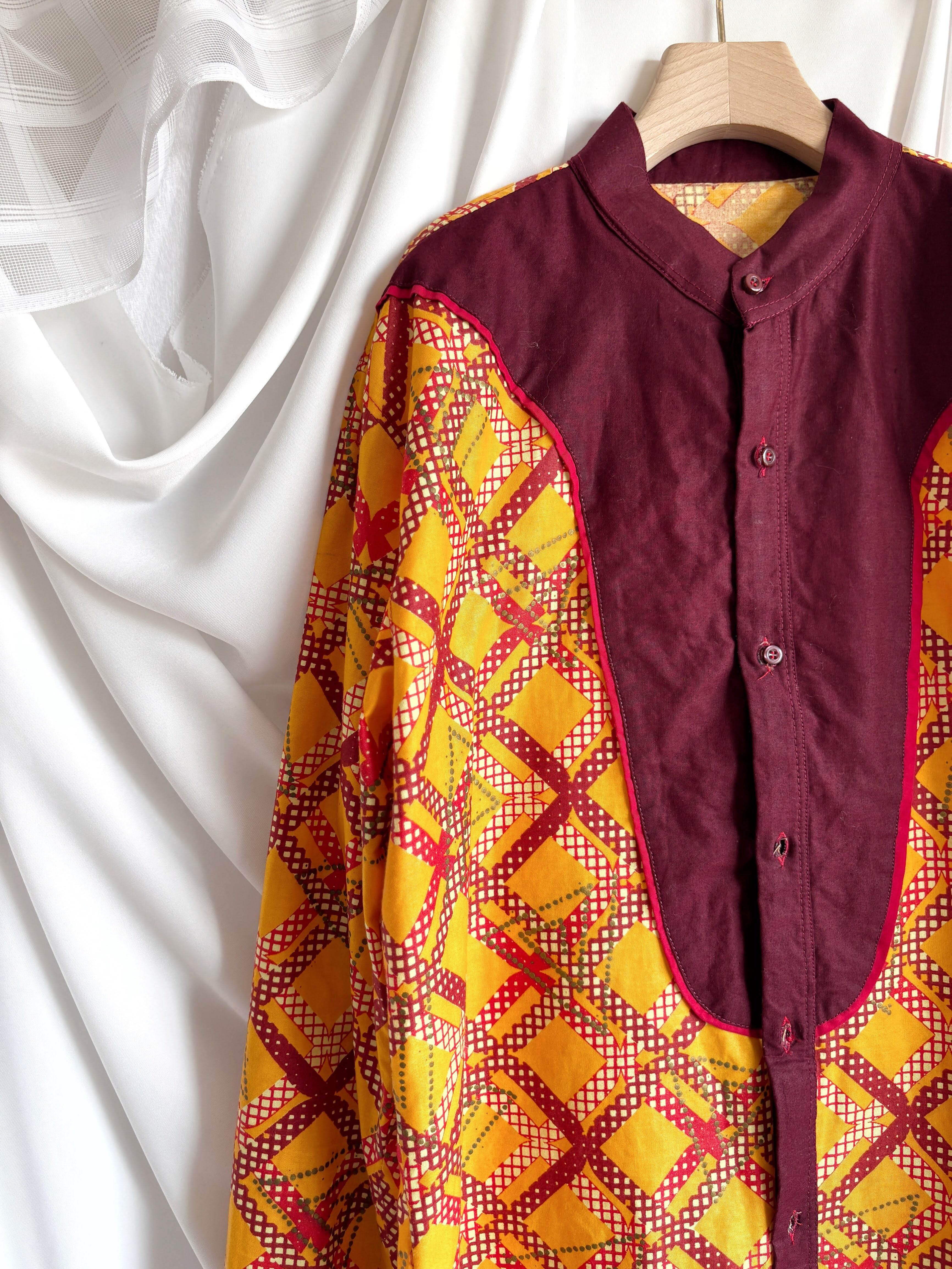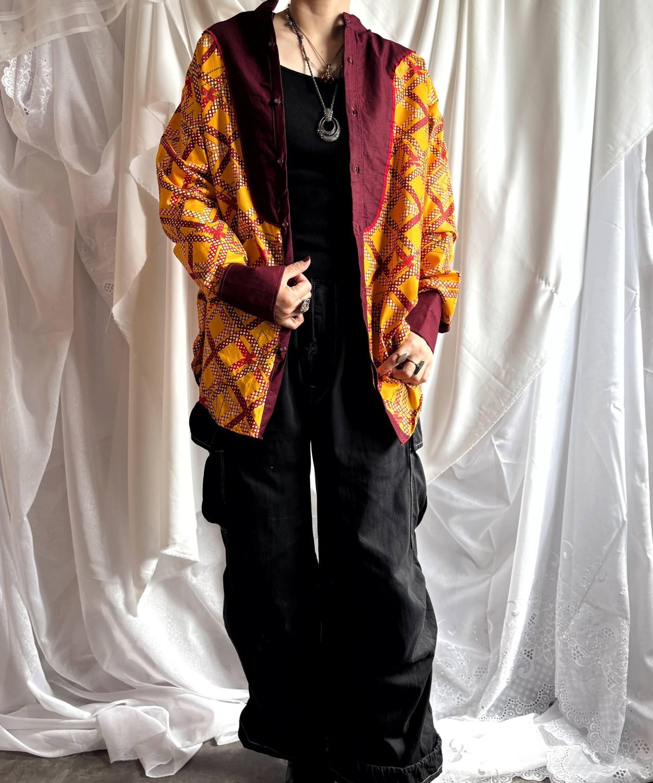 総柄のプリントデザインがかっちょいいシャツです。生地はアフリカンバティックっぽさがありますが不明です(そのくらいしっかりしていて鮮やかです)胸元のエンジカラーの無地生地との切り替えも洒落ていて、繋ぎ目はパイピング(リボンで縫い目をくくる手法)されていてそれもまたオシャレです。
