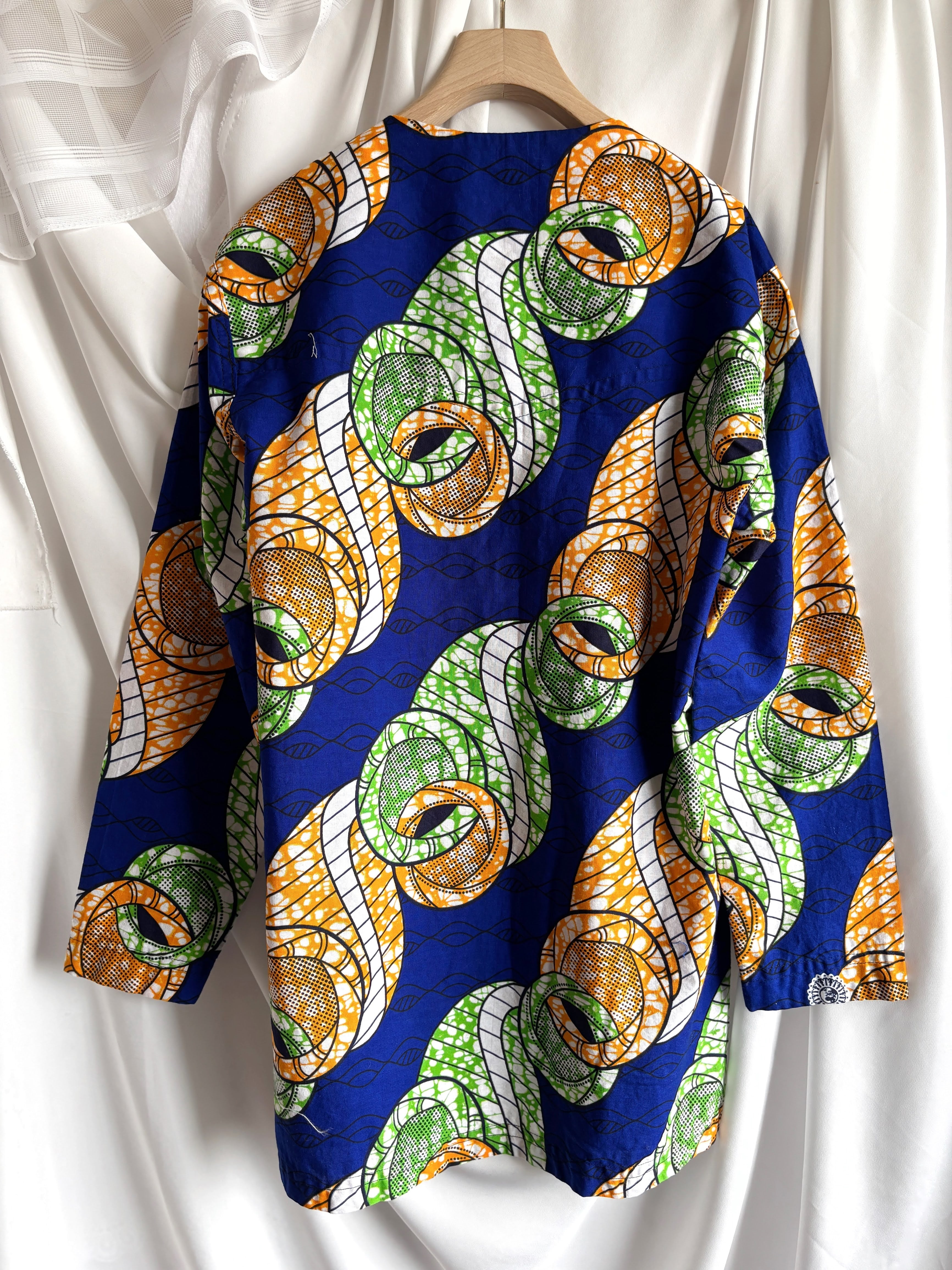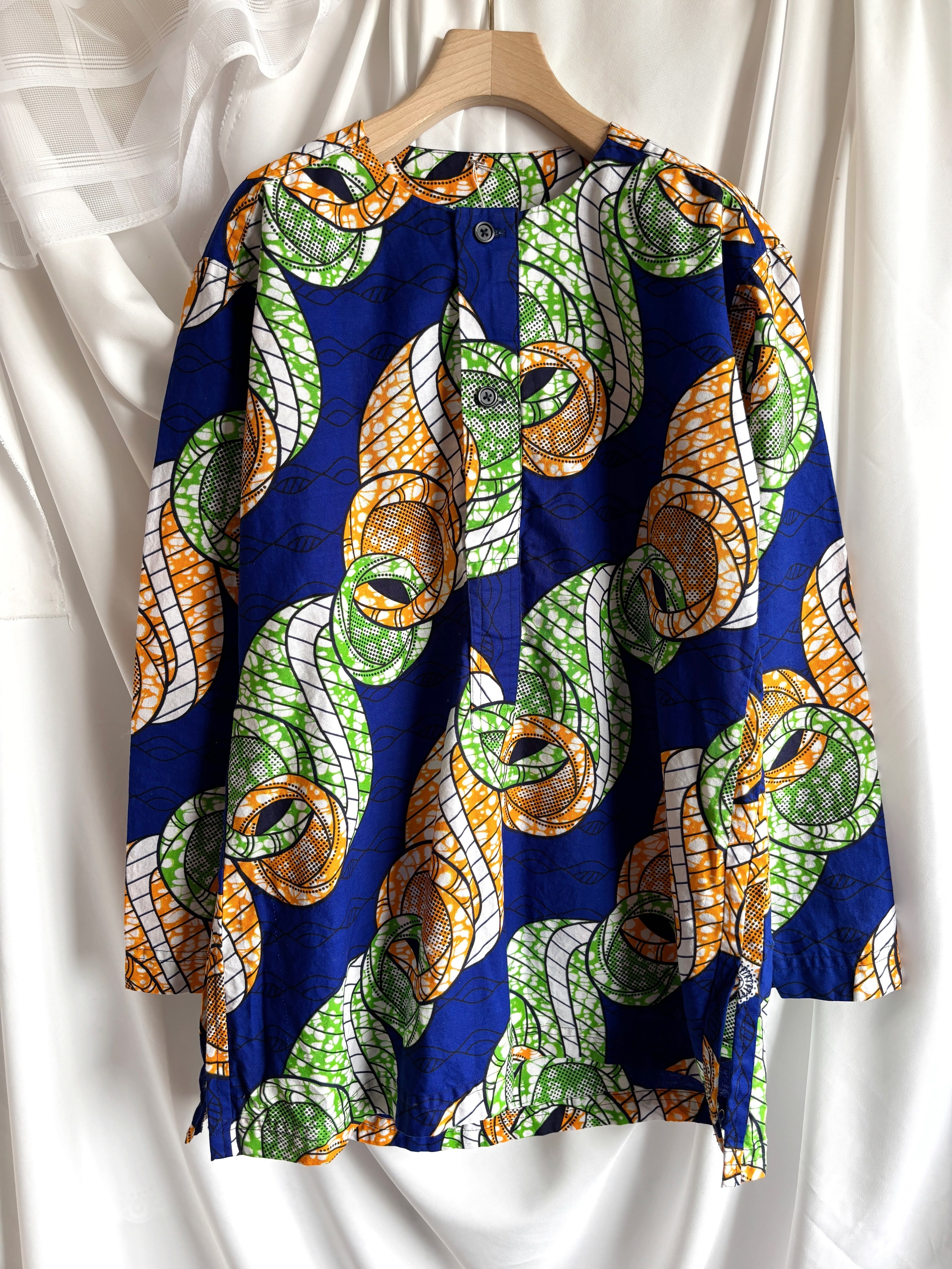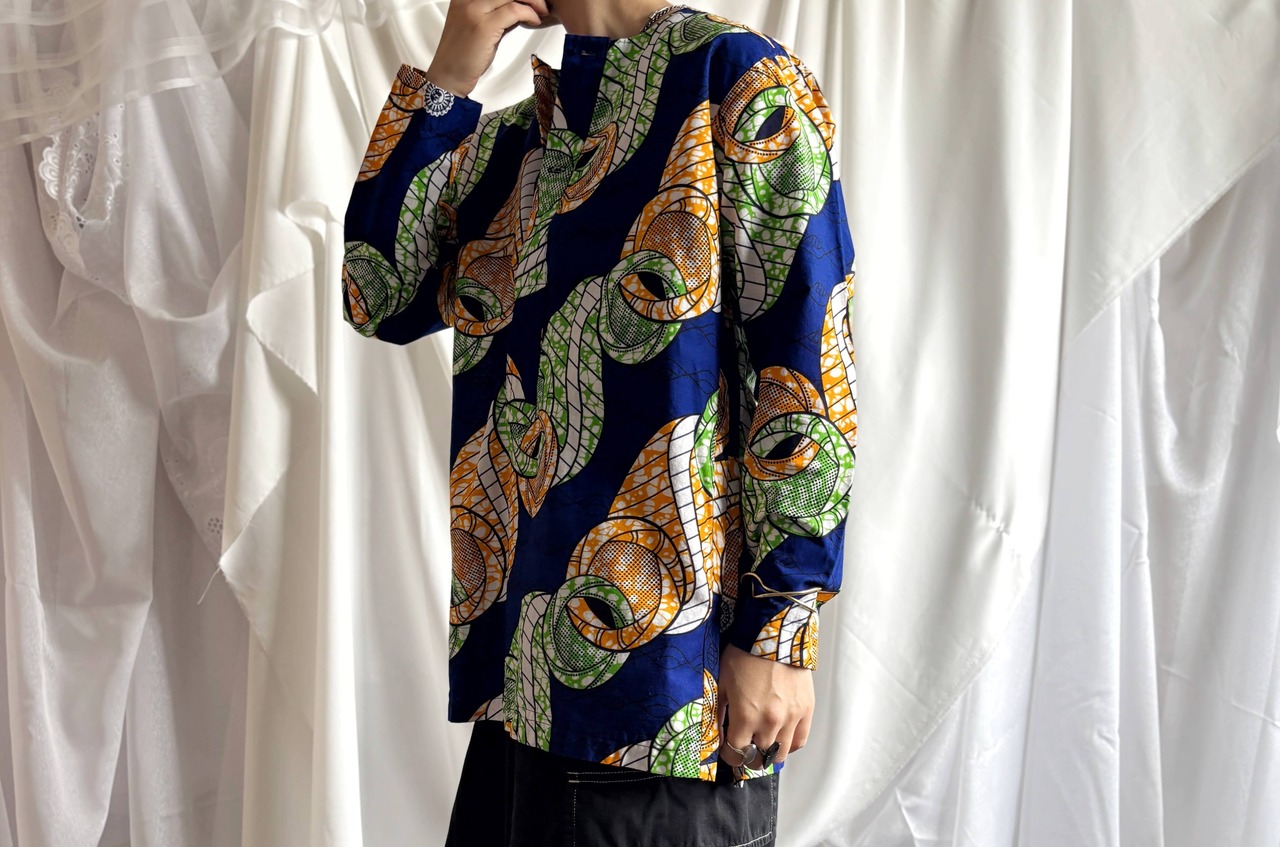 25144 アフリカンバティックハンドメイド ヴィンテージ ハーフボタン エスニック 総柄 トップス ブラウス 長袖 青 緑